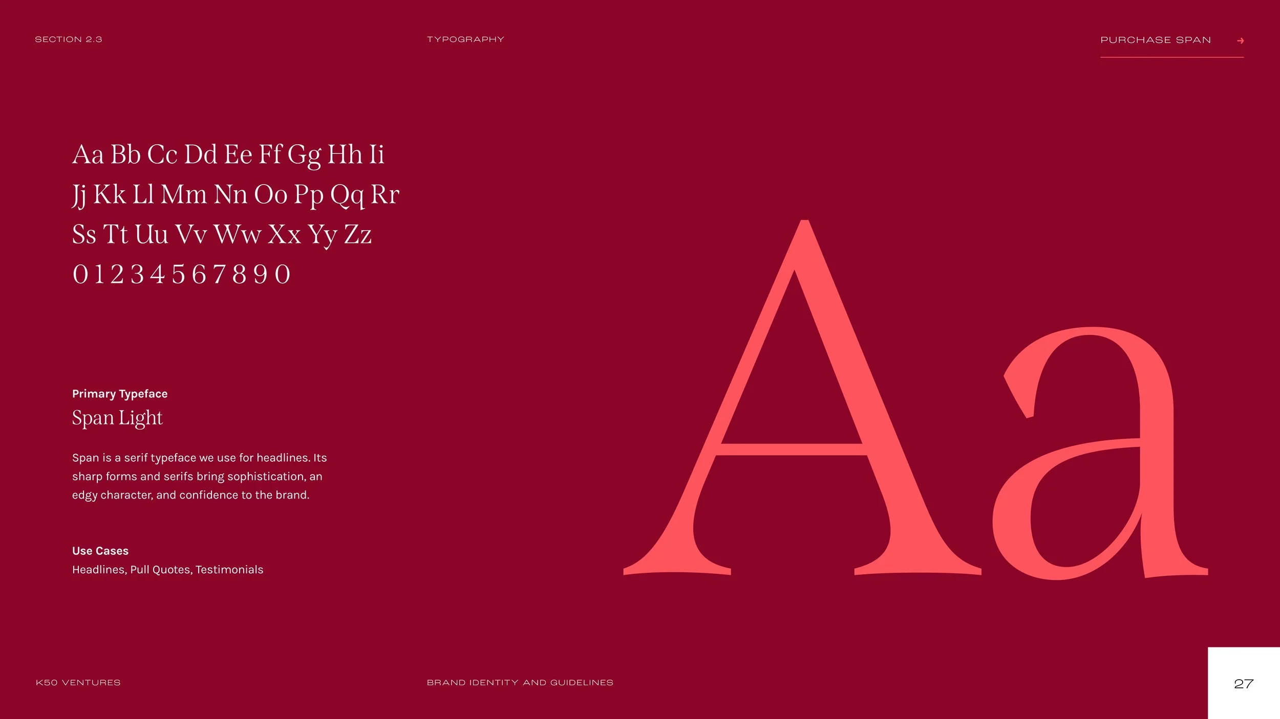 The creative direction for K50 Ventures emphasizes "elevated approachability." Approachability comes first through warm and inviting tones before bringing the vibrancy of the colors up a notch to let an inner bravery shine through and create differentiation within the market. Rich, elegant maroon and a sophisticated serif anchors the brand and conveys the heart that K50 exhibits every day through dedication to their clients while grungy textures embrace their nonconformist tendencies.