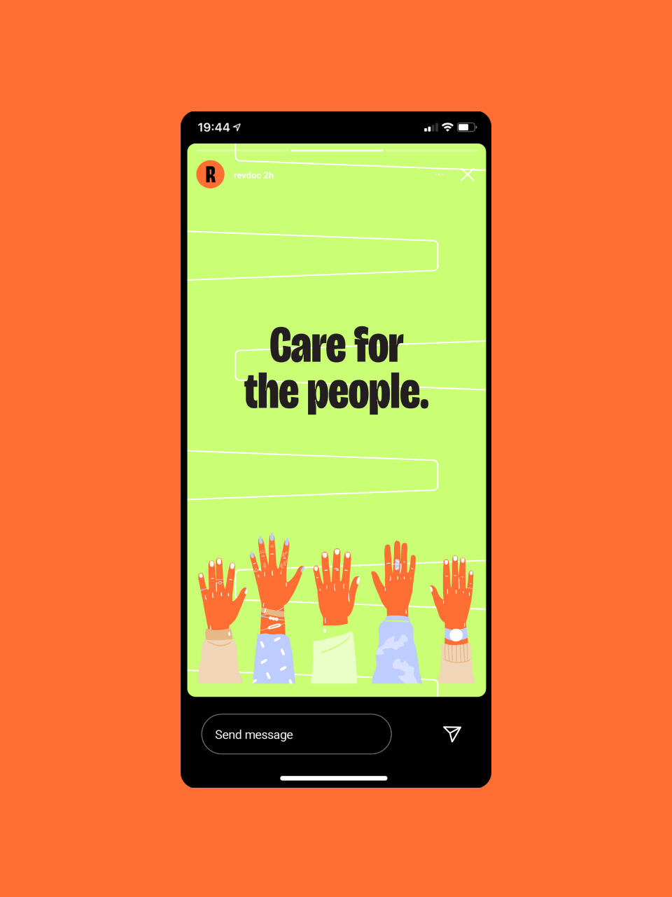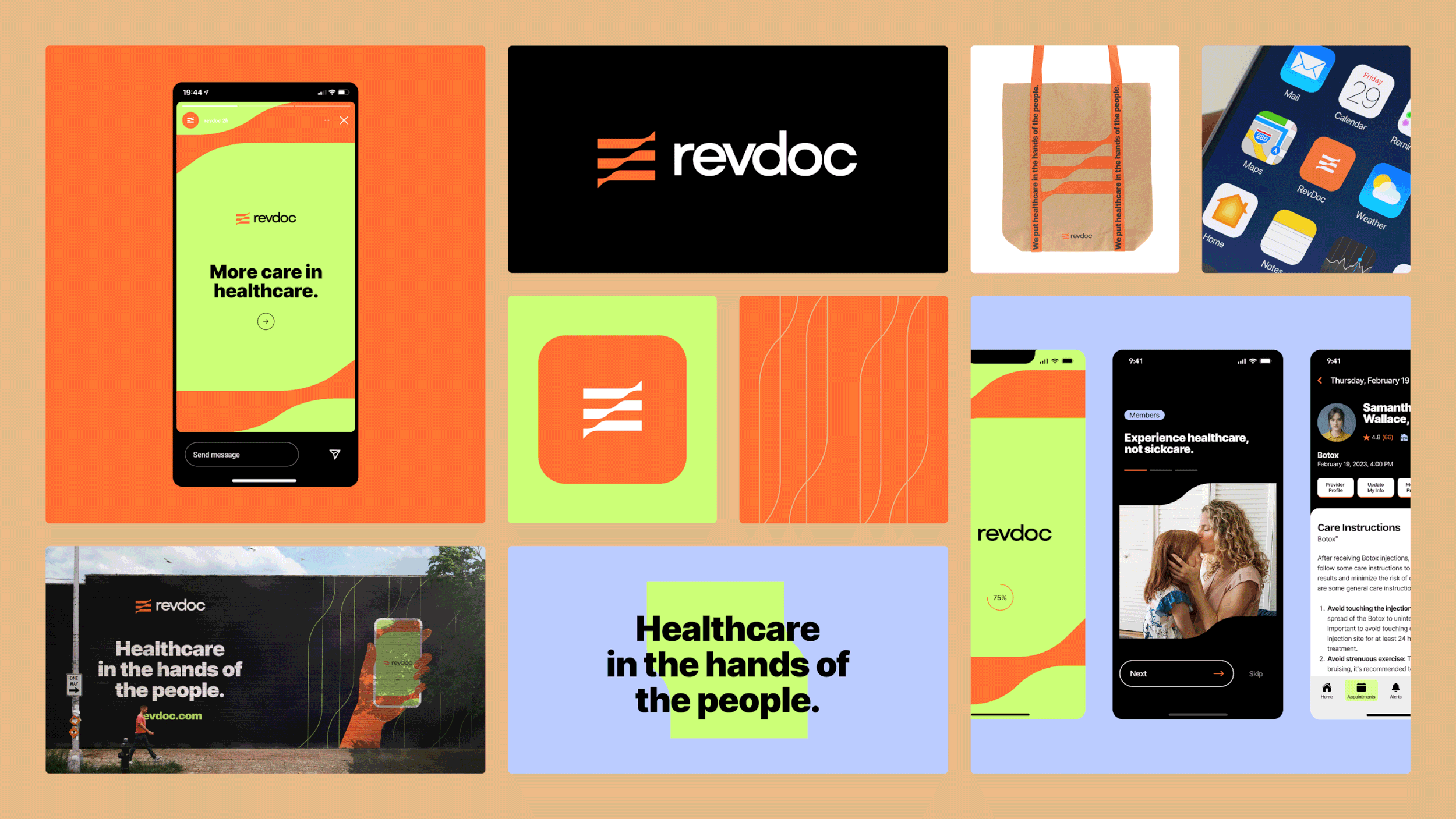 To convey a fresh and revolutionary take on healthcare, the visual design for RevDoc was built on two core concepts: nostalgia and human touch. Symbolizing “power in the hands of the people” was achieved through the use of full-color reportage photography, celebrating genuine moments and a sense of belonging. The color palette is anchored by an enthusiastic orange to project energy and optimism, while bold, uppercase sans-serif typography delivers a direct and empowering message.